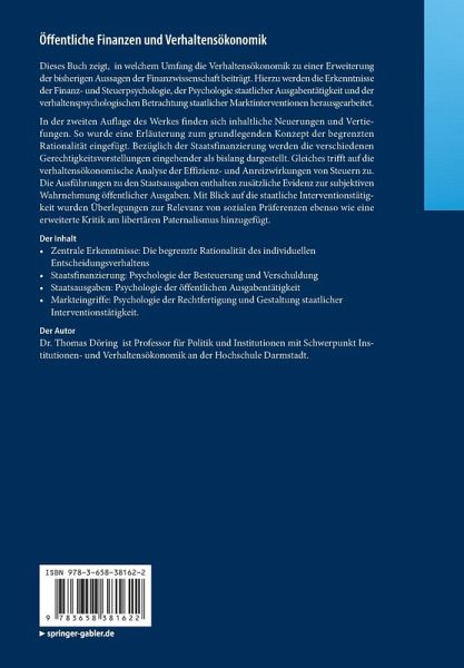 Dieses Buch beantwortet die Frage, in welchem Umfang der noch junge Ansatz der Verhaltensökonomik zu einer Erweiterung des bisherigen Erkenntnisstandes der Finanzwissenschaft beitragen kann. Dies geschieht in Form der Behandlung von drei in sich geschlossenen Themenbereichen, zu denen neben einer überblickartigen Darstellung der vorliegenden verhaltenswissenschaftlichen Untersuchungsergebnisse zur Staatsfinanzierung sowie zur öffentlichen Ausgabentätigkeit ebenso der Beitrag der Verhaltensökonomik für eine finanzwissenschaftliche Rechtfertigung und Gestaltung staatlicher Markteingriffe zählt. Zu diesem Zweck werden die zentralen Erkenntnisse der Finanz- und Steuerpsychologie, der Psychologie der staatlichen Ausgabentätigkeit und der verhaltenspsychologischen Betrachtung staatlicher Marktinterventionen aufgearbeitet, um die sich daraus ergebenden verhaltensökonomischen Korrekturen an den gängigen Einsichten der Finanzwissenschaft zu erläutern und finanzpolitische Implikationenabzuleiten.