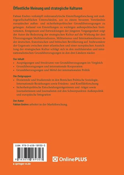 Fabian Endres verknüpft mikroanalytische Einstellungsforschung mit makrogesellschaftlichen Unterschieden, um zu einem besseren Verständnis europäischer außen- und sicherheitspolitischer Grundüberzeugungen zu gelangen. Anhand von Einstellungen zu wichtigen außenpolitischen Institutionen, Ereignissen und Entwicklungen der jüngeren Vergangenheit zeigt der Autor die Bedeutung der strategischen Kultur auf die Wirkung der drei Überzeugungen Multilateralismus, Militarismus und Internationalismus in der deutschen, französischen und britischen Bevölkerung auf. Insbesondere der Gegensatz zwischen einer atlantischen und einer europäischen Ausrichtung der strategischen Kultur schlägt sich in den multilateralen und internationalistischen Grundüberzeugungen in den drei Ländern nieder.