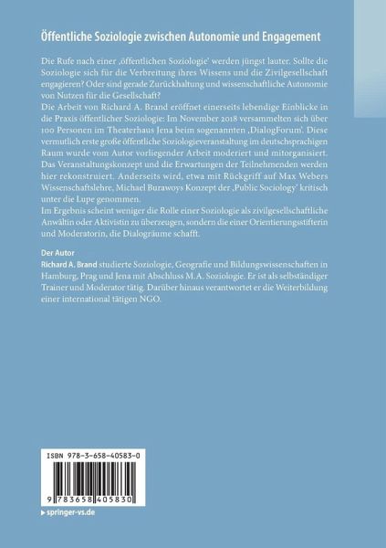 Die Arbeit von Richard A. Brand eröffnet einerseits lebendige Einblicke in die Praxis öffentlicher Soziologie: Im November 2018 versammelten sich über 100 Personen im Theaterhaus Jena beim sogenannten 'DialogForum'. Diese vermutlich erste große öffentliche Soziologieveranstaltung im deutschsprachigen Raum wurde vom Autor vorliegender Arbeit moderiert und mitorganisiert. Das Veranstaltungskonzept und die Erwartungen der Teilnehmenden werden hier rekonstruiert. Anderseits wird, etwa mit Rückgriff auf Max Webers Wissenschaftslehre, Michael Burawoys Konzept der 'Public Sociology' kritisch unter die Lupe genommen.