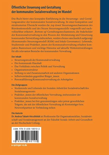 Das Buch bietet eine kompakte Einführung in die Steuerungs- und Gestaltungsansätze der kommunalen Sozialverwaltung. In einer kompakten und strukturierten Übersicht werden die 'top down' Steuerungsmechanismen des Bürokratiemodells und des Neuen Steuerungsmodells vorgestellt und nachvollziehbar erläutert. 'Bottom up' Gestaltungsmechanismen, die Stakeholder der Kommunalverwaltung in den Prozess der Abstimmung und Umsetzung kommunaler Entwicklung einbeziehen, werden ebenso anschaulich aufgezeigt (Kommunales Steuerungsmodell (KSM) und lokale Governance). Lehrende, Studierende und Praktiker_innen der Kommunalverwaltung erhalten kompaktes Basiswissen und wichtige Hinweise auf aktuelle Weiterentwicklungen für alle relevanten Bereiche der kommunalen Verwaltung.