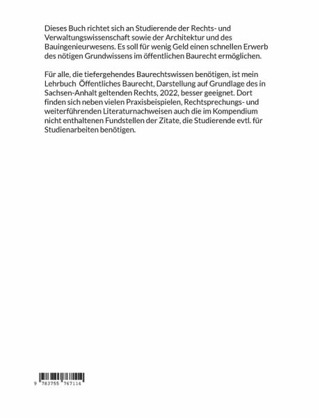 Dieses Buch richtet sich an Studierende der Rechts- und Verwaltungswissenschaft sowie der Architektur und des Bauingenieurwesens. Es soll für wenig Geld einen schnellen Erwerb des nötigen Grundwissens im öffentlichen Baurecht ermöglichen.Für alle, die tiefergehendes Baurechtswissen benötigen, ist mein Lehrbuch Öffentliches Baurecht, Darstellung auf Grundlage des in Sachsen-Anhalt geltenden Rechts, 2022, besser geeignet. Dort finden sich neben vielen Praxisbeispielen, Rechtsprechungs- und weiterführenden Literaturnachweisen auch die im Kompendium nicht enthaltenen Fundstellen der Zitate, die Studierende evtl. für Studienarbeiten benötigen.t.