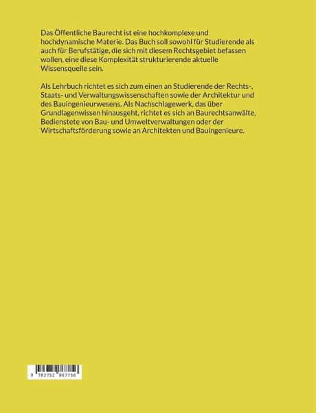 Das Öffentliche Baurecht ist eine hochkomplexe und hochdynamische Materie. Das Handbuch soll sowohl für Berufstätige wie für Studierende, die sich mit diesem Rechtsgebiet befassen, eine die Komplexität strukturierende aktuelle Wissensquelle sein.Als Nachschlagewerk, das weit über Grundlagenwissen hinausgeht, richtet es sich an Baurechtsanwälte, Bedienstete von Bau- und Umweltverwaltungen oder der Wirtschaftsförderung sowie an Architekten und Bauingenieure. Gleichwohl ist es auch als großes Lehrbuch für Studierende der Rechts-, Staats- und Verwaltungswissenschaften sowie der Architektur und des Bauingenieurwesens geeignet, indem es Grundwissen in normalgroßer Schrift und Detailwissen in kleinerer Schrift bietet.