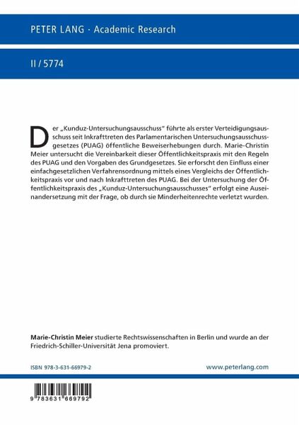 Der "Kunduz-Untersuchungsausschuss" führte als erster Verteidigungsausschuss seit Inkrafttreten des Parlamentarischen Untersuchungsausschussgesetzes (PUAG) öffentliche Beweiserhebungen durch. Marie-Christin Meier untersucht die Vereinbarkeit dieser Öffentlichkeitspraxis mit den Regeln des PUAG und den Vorgaben des Grundgesetzes. Sie erforscht den Einfluss einer einfachgesetzlichen Verfahrensordnung mittels eines Vergleichs der Öffentlichkeitspraxis vor und nach Inkrafttreten des PUAG. Bei der Untersuchung der Öffentlichkeitspraxis des "Kunduz-Untersuchungsausschusses" erfolgt eine Auseinandersetzung mit der Frage, ob durch sie Minderheitenrechte verletzt wurden.