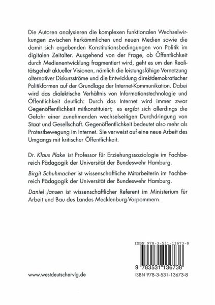 Die Autoren analysieren die komplexen funktionalen Wechselwirkungen zwischen herkömmlichen und neuen Medien sowie die damit sich ergebenden Konstitutionsbedingungen von Politik im digitalen Zeitalter. Ausgehend von der Frage, ob Öffentlichkeit durch Medienentwicklung fragmentiert wird, geht es um den Realitätsgehalt aktueller Visionen, nämlich die leistungsfähige Vernetzung alternativer Diskursströme und die Entwicklung direktdemokratischer Politikformen auf der Grundlage der Internet-Kommunikation. Dabei wird das dialektische Verhältnis von Informationstechnologie und Öffentlichkeit deutlich: Durch das Internet wird immer zwar Gegenöffentlichkeit mitkonstituiert; es ergibt sich allerdings die Gefahr einer zunehmenden wechselseitigen Durchdringung von Staat und Gesellschaft. Gegenöffentlichkeit bedeutet also mehr als Protestbewegung im Internet. Sie verweist auf eine neue Art des Umgangs mit kritischer Öffentlichkeit.