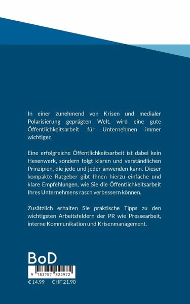 In einer zunehmend von Krisen und medialer Polarisierung geprägten Welt, wird eine gute Öffentlichkeitsarbeit für Unternehmen immer wichtiger. Eine erfolgreiche Öffentlichkeitsarbeit ist dabei kein Hexenwerk, sondern folgt klaren und verständlichen Prinzipien, die jede und jeder anwenden kann. Dieser kompakte Ratgeber gibt Ihnen hierzu einfache und klare Empfehlungen an die Hand, wie Sie die Öffentlichkeitsarbeit Ihres Unternehmens professionalisieren und rasch verbessern können. Zusätzlich erhalten Sie praktische Tipps zu den wichtigsten PR-Arbeitsfeldern wie Pressearbeit, interne Kommunikation und Krisenmanagement.