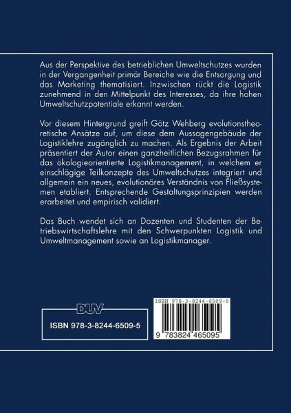 Aus der Perspektive des betrieblichen Umweltschutzes wurden in der Vergangenheit primär Bereiche wie die Entsorgung und das Marketing thematisiert. Inzwischen rückt die Logistik zunehmend in den Mittelpunkt des Interesses, da ihre hohen Umweltschutzpotentiale erkannt werden. Vor diesem Hintergrund greift Götz Wehberg evolutionstheoretische Ansätze auf, um diese dem Aussagengebäude der Logistiklehre zugänglich zu machen. Als Ergebnis der Arbeit präsentiert der Autor einen ganzheitlichen Bezugsrahmen für das ökologieorientierte Logistikmanagement, in welchem er einschlägige Teilkonzepte des Umweltschutzes integriert und allgemein ein neues, evolutionäres Verständnis von Fließsystemen etabliert. Entsprechende Gestaltungsprinzipien werden erarbeitet und empirisch validiert.