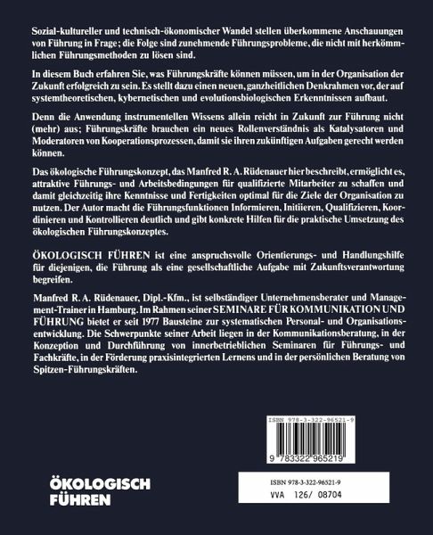 1 Vorbemerkungen.- 1.1 Führung aus ökologischer Sicht.- 1.2 Der Aufbau des Buches.- 1.3 Hilfe zur Selbsthilfe.- 2 Führen ist Zukunftsgestaltung.- 2.1 Warum Führen schwieriger geworden ist.- 2.2 Was die Weiterentwicklung der Führung erschwert.- 2.3 Vom mechanischen zum organischen Führungsmodell.- 3 Führen im 21. Jahrhundert.- 3.1 Gesellschaft im Umbruch.- 3.2 Sozial-kultureller Wandel fordert Führungskräfte.- 3.3 Ursachen veränderter Anforderungen an die Führung.- 3.4 Neue Bedürfnisse treten in den Vordergrund.- 3.5 Ungenutzte menschliche Potentiale.- 3.6 Herausforderungen schaffen!.- 3.7 Menschliches Glück und menschliche Leistung verschenken?.- 3.8 Zusammenfassung: Die Führungsanforderungen der Zukunft.- 3.9 (Gewissens-)Fragen zu Ihrer Führungssituation.- 4 Das Ganze ist mehr als die Summe seiner Teile.- 4.1 Systemschau der Organisation - Erkenntnis- und Handlungshilfe.- 4.2 Der Mensch als Führer und Geführter in der Organisation.- 4.3 Elemente eines ökologischen Führungskonzepts.- 5 Die Führungsfunktionen effektiv wahrnehmen.- 5.1 Ökologische Führung in der Praxis.- 5.2 Informieren - Information geben und einholen, Analysieren.- 5.3 Initiieren - Ziele setzen, Planen, Entscheiden, Anweisen, Delegieren.- 5.4 Qualifizieren - Einweisen, Unterweisen, Trainieren.- 5.5 Koordinieren und Kooperieren - Beraten, Strukturieren, Vermitteln, Begleiten, Problemlösen, Unterstützen.- 5.6 Kontrollieren - Überwachen, Beurteilen, Rückmelden.- 6 Schlußbemerkung.- Stichwortverzeichnis.