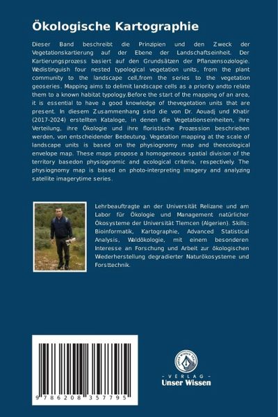 Dieser Band beschreibt die Prinzipien und den Zweck der Vegetationskartierung auf der Ebene der Landschaftseinheit. Der Kartierungsprozess basiert auf den Grundsätzen der Pflanzensoziologie. Wedistinguish four nested typological vegetation units, from the plant community to the landscape cell,from the series to the vegetation geoseries. Mapping aims to delimit landscape cells as a priority andto relate them to a known habitat typology.Before the start of the mapping of an area, it is essential to have a good knowledge of thevegetation units that are present. In diesem Zusammenhang sind die von Dr. Aouadj und Khatir (2017-2024) erstellten Kataloge, in denen die Vegetationseinheiten, ihre Verteilung, ihre Ökologie und ihre floristische Prozession beschrieben werden, von entscheidender Bedeutung. Vegetation mapping at the scale of landscape units is based on the physiognomy map and theecological envelope map. These maps propose a homogeneous spatial division of the territory basedonphysiognomic and ecological criteria, respectively. The physiognomy map is based on photo-interpreting imagery and analyzing satellite imagerytime series.