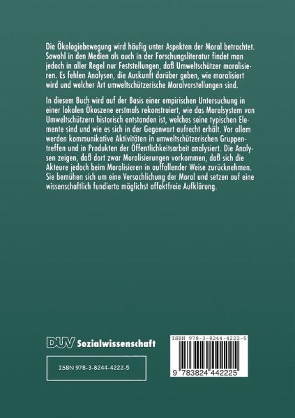 Die Ökologiebewegung wird häufig unter Aspekten der Moral betrachtet. Sowohl in den Medien als auch in der Forschungsliteratur findet man jedoch in aller Regel nur Feststellungen, daß Umweltschützer moralisieren. Es fehlen Analysen, die Auskunft darüber geben, wie moralisiert wird und welcher Art umweltschützerische Moralvorstellungen sind. In diesem Buch wird auf der Basis einer empirischen Untersuchung in einer lokalen Ökoszene erstmals rekonstruiert, wie das Moralsystem von Umweltschützern historisch entstanden ist, welches seine typischen Elemente sind und wie es sich in der Gegenwart aufrecht erhält. Vor allem werden kommunikative Aktivitäten in umweltschützerischen Gruppentreffen und in Produkten der Öffentlichkeitsarbeit analysiert. Die Analysen zeigen, daß dort zwar Moralisierungen vorkommen, daß sich die Akteure jedoch beim Moralisieren in auffallender Weise zurücknehmen. Sie bemühen sich um eine Versachlichung der Moral und setzen auf eine wissenschaftlich fundierte möglichst affektfreie Aufklärung.