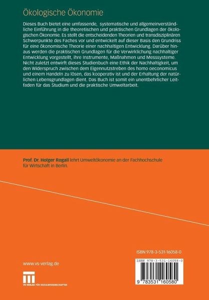 Dieses Buch bietet eine umfassende, systematische und allgemeinverständliche Einführung in die theoretischen und praktischen Grundlagen der ökologischen Ökonomie. Es stellt die entscheidenden Theorien und transdisziplinären Schwerpunkte des Faches vor und entwickelt auf dieser Basis den Grundriss für die ökonomische Theorie einer nachhaltigen Entwicklung. Darüber hinaus werden die praktischen Grundlagen für die Verwirklichung nachhaltiger Entwicklung vorgestellt, ihre Instrumente, Maßnahmen und Messsysteme. Nicht zuletzt entwirft dieses Studienbuch eine Ethik der Nachhaltigkeit um den Widerspruch zwischen dem Eigennutzstreben des homo oeconomicus und einem Handeln zu lösen, das kooperativ ist und der Erhaltung der natürlichen Lebensgrundlagen dient. Das Buch ist somit ein unentbehrlicher Leitfaden für das Studium und die praktische Umweltarbeit.