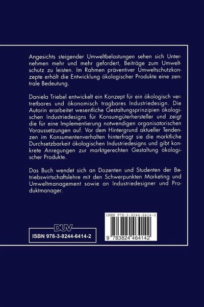 Angesichts steigender Umweltbelastungen sehen sich Unternehmen mehr und mehr gefordert, Beiträge zum Umweltschutz zu leisten. Im Rahmen präventiver Umweltschutzkonzepte erhält die Entwicklung ökologischer Produkte eine zentrale Bedeutung. Daniela Triebel entwickelt ein Konzept für ein ökologisch vertretbares und ökonomisch tragbares Industriedesign. Die Autorin erarbeitet wesentliche Gestaltungsprinzipien ökologischen Industriedesigns für Konsumgüterhersteller und zeigt die für eine Implementierung notwendigen organisatorischen Voraussetzungen auf. Vor dem Hintergrund aktueller Tendenzen im Konsumentenverhalten hinterfragt sie die marktliche Durchsetzbarkeit ökologischen Industriedesigns und gibt konkrete Anregungen zur marktgerechten Gestaltung ökologischer Produkte.