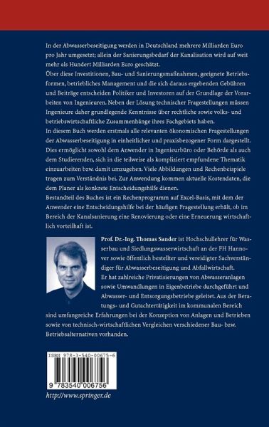 In der Abwasserbeseitigung werden in Deutschland mehrere Milliarden Euro pro Jahr umgesetzt; allein der Sanierungsbedarf der Kanalisation wird auf weit mehr als Hundert Milliarden Euro geschätzt. Über diese Investitionen, Bau- und Sanierungsmaßnahmen, geeignete Betriebsformen, betriebliches Management und die sich daraus ergebenden Gebühren und Beiträge entscheiden Politiker und Investoren auf der Grundlage der Vorarbeiten von Ingenieuren. Neben der Lösung technischer Fragestellungen müssen Ingenieure daher grundlegende Kenntnisse über rechtliche sowie volks- und betriebswirtschaftliche Zusammenhänge ihres Fachgebiets haben. In diesem Buch werden erstmals alle relevanten ökonomischen Fragestellungen der Abwasserbeseitigung in einheitlicher und praxisbezogener Form dargestellt. Dies ermöglicht sowohl dem Anwender in Ingenieurbüro oder Behörde als auch dem Studierenden, sich in die teilweise als kompliziert empfundene Thematik einzuarbeiten bzw. damit umzugehen. Viele Abbildungen und Rechenbeispiele tragen zum Verständnis bei. Zur Anwendung kommen aktuelle Kostendaten, die dem Planer als konkrete Entscheidungshilfe dienen. Bestandteil des Buches ist ein Rechenprogramm auf Excel-Basis, mit dem der Anwender eine Entscheidungshilfe bei der häufigen Fragestellung erhält, ob im Bereich der Kanalsanierung eine Renovierung oder eine Erneuerung wirtschaftlich vorteilhaft ist.Zum Autor: Prof. Dr.-Ing. Thomas Sander ist Hochschullehrer für Wasserbau und Siedlungswasserwirtschaft an der FH Hannover sowie öffentlich bestellter und vereidigter Sachverständiger für Abwasserbeseitigung und Abfallwirtschaft. Er hat zahlreiche Privatisierungen von Abwasseranlagen sowie Umwandlungen in Eigenbetriebe durchgeführt und Abwasser- und Entsorgungsbetriebe geleitet.
