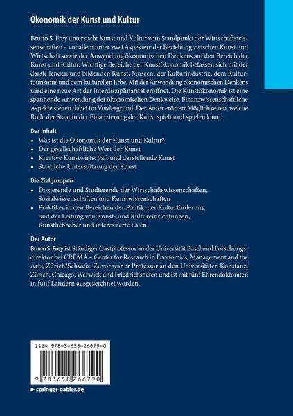 Bruno S. Frey ist Ständiger Gastprofessor an der Universität Basel und Forschungsdirektor bei CREMA - Center for Research in Economics, Management and the Arts, Zürich/Schweiz. Zuvor war er Professor an den Universitäten Konstanz, Zürich, Chicago, Warwick und Friedrichshafen und ist mit fünf Ehrendoktoraten in fünf Ländern ausgezeichnet worden.
