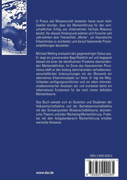 Michael Welling analysiert den gegenwärtigen Status quo. Er zeigt ein gravierendes Begriffsdefizit auf und begegnet diesem mit einer die identifizierten Probleme überwindenden Markendefinition. Im Sinne des theoretischen Pluralismus stellt er den bislang dominierenden verhaltenswissenschaftlichen Untersuchungen mit der Ökonomik ein alternatives Erkenntnisobjekt zur Seite. Er legt die Möglichkeiten verfügungsrechtlicher und vor allem informationsökonomischer Analysen dar und erarbeitet damit ein (alternatives) Fundament für die noch immer defizitäre Markentheorie.