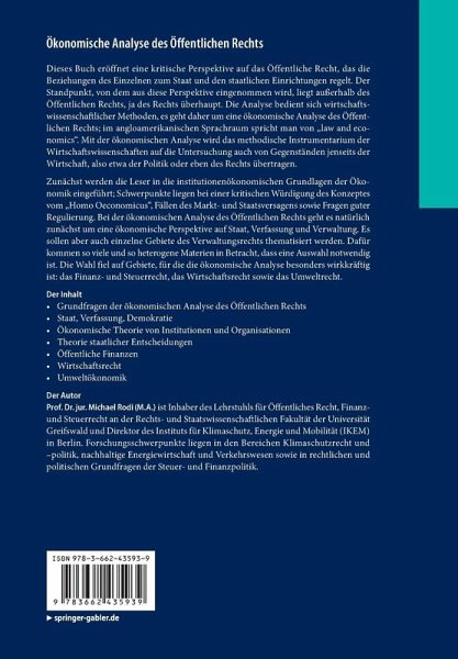 Grundfragen der ökonomischen Analyse des Öffentlichen Rechts.- Staat, Verfassung, Demokratie.- Ökonomische Theorie von Institutionen und Organisationen.- Theorie staatlicher Entscheidungen.- Öffentliche Finanzen.- Wirtschaftsrecht.- Umweltökonomik.