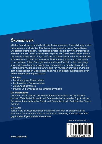 Mit der Finanzkrise ist auch die klassische ökonomische Theoriebildung in eine Krise geraten: In effizienten Märkten sollte es eigentlich keine Asset-Blasen und Börsencrashs geben. Als interdisziplinärer Ansatz der Wirtschaftswissenschaften und der Physik besteht der Anspruch der Ökonophysik darin, Methoden aus der statistischen Physik auf das komplexe System des Finanzmarktes anzuwenden und damit ökonomische Phänomene qualitativ und quantitativ zu modellieren. Tobias Preis gibt einen fundierten Einblick in das noch junge interdisziplinäre Forschungsgebiet und entwickelt ein Orderbuchmodell zur Finanzmarktsimulation auf der Grundlage von Multiagentensystemen. Mit diesem mikroskopischen Modell lassen sich viele empirische Eigenschaften von realen Börsendaten reproduzieren.