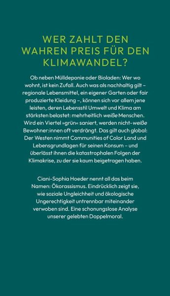 Wer zahlt den wahren Preis für unsere Umweltkrise? Ciani-Sophia Hoeder über die Verflechtungen zwischen ökologischer Ungerechtigkeit und Rassismus Ob eine Person neben einer Mülldeponie oder im Grünen lebt, indigene Gemeinschaften zugunsten des westlichen Konsums enteignet oder durch »green gentrification« ganze Personengruppen verdrängt werden - all das ist kein Zufall, dahinter steckt Ökorassismus. Auch die fortschreitende Erderwärmung trifft systematisch People of Color, während der weiße Westen von einem Lebensstil profitiert, der die Welt an den Abgrund bringt. Eindrücklich zeigt Ciani-Sophia Hoeder, warum Bambuszahnbürsten die Welt nicht retten und was hinter »grünen Nazis« steckt. Ein Buch über die oft unsichtbaren Zusammenhänge zwischen Ökologie und Rassismus - aufrüttelnd, persönlich und hochaktuell.