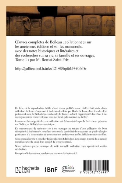 Oeuvres completes de Boileau: collationnees sur les anciennes editions et sur les manuscrits, avec des notes historiques et litteraires et des recherches sur sa vie, sa famille et ses ouvrages. Tome 1 / par M. Berriat-Saint-PrixDate de l'edition originale: 1837Ce livre est la reproduction fidele d'une oeuvre publiee avant 1920 et fait partie d'une collection de livres reimprimes a la demande editee par Hachette Livre, dans le cadre d'un partenariat avec la Bibliotheque nationale de France, offrant l'opportunite d'acceder a des ouvrages anciens et souvent rares issus des fonds patrimoniaux de la BnF.Les oeuvres faisant partie de cette collection ont ete numerisees par la BnF et sont presentes sur Gallica, sa bibliotheque numerique.En entreprenant de redonner vie a ces ouvrages au travers d'une collection de livres reimprimes a la demande, nous leur donnons la possibilite de rencontrer un public elargi et participons a la transmission de connaissances et de savoirs parfois difficilement accessibles.Nous avons cherche a concilier la reproduction fidele d'un livre ancien a partir de sa version numerisee avec le souci d'un confort de lecture optimal. Nous esperons que les ouvrages de cette nouvelle collection vous apporteront entiere satisfaction.Pour plus d'informations, rendez-vous sur www.hachettebnf.frhttp: //gallica.bnf.fr/ark: /12148/bpt6k5450665r