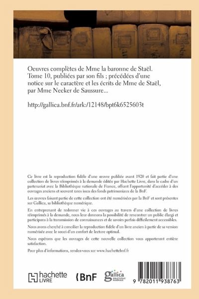 Oeuvres complètes de Mme la baronne de Staël. Tome 10 /, publiées par son fils; précédées d'une notice sur le caractère et les écrits de Mme de Staël, par Mme Necker de Saussure... Date de l'édition originale: 1820-1821 Le présent ouvrage s'inscrit dans une politique de conservation patrimoniale des ouvrages de la littérature Française mise en place avec la BNF. HACHETTE LIVRE et la BNF proposent ainsi un catalogue de titres indisponibles, la BNF ayant numérisé ces oeuvres et HACHETTE LIVRE les imprimant à la demande. Certains de ces ouvrages reflètent des courants de pensée caractéristiques de leur époque, mais qui seraient aujourd'hui jugés condamnables. Ils n'en appartiennent pas moins à l'histoire des idées en France et sont susceptibles de présenter un intérêt scientifique ou historique. Le sens de notre démarche éditoriale consiste ainsi à permettre l'accès à ces oeuvres sans pour autant que nous en cautionnions en aucune façon le contenu. Pour plus d'informations, rendez-vous sur www.hachettebnf.fr