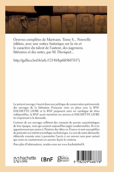 Oeuvres complètes de Marivaux. Tome 8 / ... Nouvelle édition, avec une notice historique sur la vie et le caractère du talent de l'auteur, des jugemens littéraires et des notes, par M. Duviquet... Date de l'édition originale: 1825-1830 Le présent ouvrage s'inscrit dans une politique de conservation patrimoniale des ouvrages de la littérature Française mise en place avec la BNF. HACHETTE LIVRE et la BNF proposent ainsi un catalogue de titres indisponibles, la BNF ayant numérisé ces oeuvres et HACHETTE LIVRE les imprimant à la demande. Certains de ces ouvrages reflètent des courants de pensée caractéristiques de leur époque, mais qui seraient aujourd'hui jugés condamnables. Ils n'en appartiennent pas moins à l'histoire des idées en France et sont susceptibles de présenter un intérêt scientifique ou historique. Le sens de notre démarche éditoriale consiste ainsi à permettre l'accès à ces oeuvres sans pour autant que nous en cautionnions en aucune façon le contenu. Pour plus d'informations, rendez-vous sur www.hachettebnf.fr
