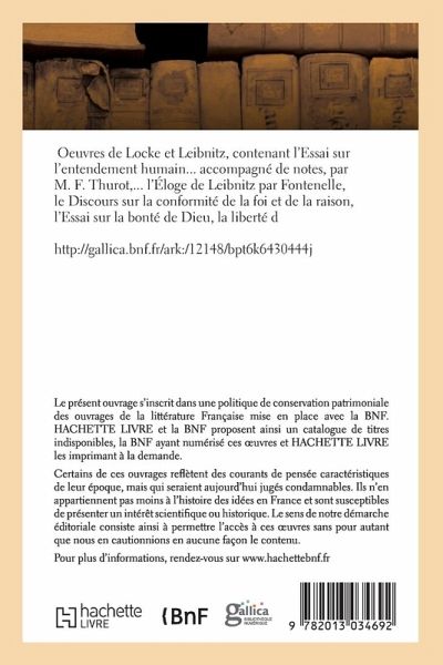 Oeuvres de Locke et Leibnitz, contenant l'Essai sur l'entendement humain... accompagné de notes, par M. F. Thurot, ... l'Éloge de Leibnitz par Fontenelle, le Discours sur la conformité de la foi et de la raison, l'Essai sur la bonté de Dieu, la liberté de l'homme et l'origine du mal, la Controverse réduite à des arguments de forme Date de l'édition originale: 1839 Comprend: Éloge de M. Leibnitz Le présent ouvrage s'inscrit dans une politique de conservation patrimoniale des ouvrages de la littérature Française mise en place avec la BNF. HACHETTE LIVRE et la BNF proposent ainsi un catalogue de titres indisponibles, la BNF ayant numérisé ces oeuvres et HACHETTE LIVRE les imprimant à la demande. Certains de ces ouvrages reflètent des courants de pensée caractéristiques de leur époque, mais qui seraient aujourd'hui jugés condamnables. Ils n'en appartiennent pas moins à l'histoire des idées en France et sont susceptibles de présenter un intérêt scientifique ou historique. Le sens de notre démarche éditoriale consiste ainsi à permettre l'accès à ces oeuvres sans pour autant que nous en cautionnions en aucune façon le contenu. Pour plus d'informations, rendez-vous sur www.hachettebnf.fr
