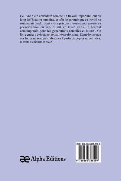 Oeuvres de Marcel Schwob. Volume 1; Spicilège" est un livre classique, qui a eu une valeur significative tout au long de l'histoire, et pour garantir que sa sagesse intemporelle ne soit jamais perdue, Alpha Editions l'a soigneusement préservé en le republiant dans un format moderne et accessible aux générations présentes et futures. Soigneusement reformaté, retapé , et nouvellement conçue, cette édition offre un texte clair et lisible, sans copies numérisées de l'uvre originale, Alpha Editions se consacre à insuffler une nouvelle vie aux livres anciens et classiques, rendant ces trésors littéraires à nouveau disponibles pour les lecteurs qui chérissent l'histoire. culture et savoir intemporel.