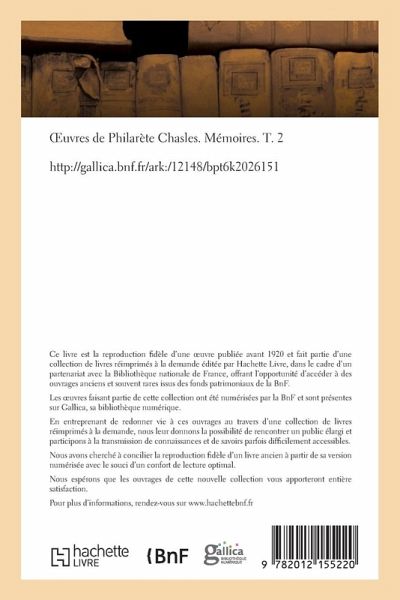 Oeuvres de Philarete Chasles. Memoires. T. 2Sujet de l'ouvrage: Chasles, Philarete (1798-1873) -- BiographiesChasles, PhilareteCe livre est la reproduction fidele d'une oeuvre publiee avant 1920 et fait partie d'un projet propose par la Bibliotheque nationale de France (BnF), offrant l'opportunite pour les lecteurs, enseignants ou chercheurs d'acceder a des ouvrages anciens et souvent rares issus de ses fonds patrimoniaux.Les oeuvres de cette collection appartiennent au domaine public . Elles ont ete numerisees par la BnF et sont presentes sur Gallica, la bibliotheque numerique de la BnF.En entreprenant de redonner vie a ces oeuvres au travers d'une collection de livres reimprimes a la demande, nous offrons la possibilite a ces oeuvres de rencontrer un public elargi et participons a la transmission de connaissances et de savoirs difficilement accessibles par ailleurs.Sur un plan technique, nous avons cherche a concilier la reproduction fidele d'un livre ancien a partir de sa version numerisee avec le souci d'un confort de lecture optimal. Nous esperons que les ouvrages de cette nouvelle collection vous apporteront entiere satisfaction.http: //gallica.bnf.fr/ark: /12148/bpt6k2026151