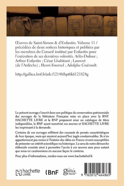 Oeuvres de Saint-Simon & d'Enfantin. Volume 11 / précédées de deux notices historiques et publiées par les membres du Conseil institué par Enfantin pour l'exécution de ses dernières volontés. [Arlès-Dufour; Arthur Enfantin; César Lhabitant; Laurent (de l'Ardèche); Henri Fournel; Adolphe Guéroult.] Date de l'édition originale: 1865-1878 Comprend: Aux saint-simoniens, gardiens de leur foi au nouveau christianisme; Discours préliminaire. La République, le péril social et le nouveau christianisme; Un coup d'oeil historique sur le péril social et l'ultramontanisme en France depuis le moyen âge jusqu'à la fin du XIXe siècle Le présent ouvrage s'inscrit dans une politique de conservation patrimoniale des ouvrages de la littérature Française mise en place avec la BNF. HACHETTE LIVRE et la BNF proposent ainsi un catalogue de titres indisponibles, la BNF ayant numérisé ces oeuvres et HACHETTE LIVRE les imprimant à la demande. Certains de ces ouvrages reflètent des courants de pensée caractéristiques de leur époque, mais qui seraient aujourd'hui jugés condamnables. Ils n'en appartiennent pas moins à l'histoire des idées en France et sont susceptibles de présenter un intérêt scientifique ou historique. Le sens de notre démarche éditoriale consiste ainsi à permettre l'accès à ces oeuvres sans pour autant que nous en cautionnions en aucune façon le contenu. Pour plus d'informations, rendez-vous sur www.hachettebnf.fr