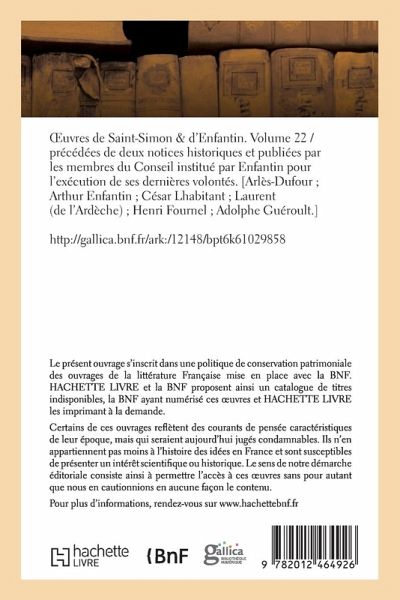 Oeuvres de Saint-Simon & d'Enfantin. Volume 22 / précédées de deux notices historiques et publiées par les membres du Conseil institué par Enfantin pour l'exécution de ses dernières volontés. [Arlès-Dufour; Arthur Enfantin; César Lhabitant; Laurent (de l'Ardèche); Henri Fournel; Adolphe Guéroult.] Date de l'édition originale: 1865-1878 Comprend: Aux saint-simoniens, gardiens de leur foi au nouveau christianisme; Discours préliminaire. La République, le péril social et le nouveau christianisme; Un coup d'oeil historique sur le péril social et l'ultramontanisme en France depuis le moyen âge jusqu'à la fin du XIXe siècle Le présent ouvrage s'inscrit dans une politique de conservation patrimoniale des ouvrages de la littérature Française mise en place avec la BNF. HACHETTE LIVRE et la BNF proposent ainsi un catalogue de titres indisponibles, la BNF ayant numérisé ces oeuvres et HACHETTE LIVRE les imprimant à la demande. Certains de ces ouvrages reflètent des courants de pensée caractéristiques de leur époque, mais qui seraient aujourd'hui jugés condamnables. Ils n'en appartiennent pas moins à l'histoire des idées en France et sont susceptibles de présenter un intérêt scientifique ou historique. Le sens de notre démarche éditoriale consiste ainsi à permettre l'accès à ces oeuvres sans pour autant que nous en cautionnions en aucune façon le contenu. Pour plus d'informations, rendez-vous sur www.hachettebnf.fr