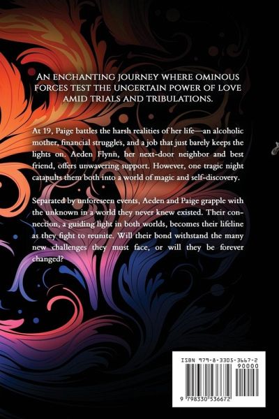 An enchanting journey where ominous forces test the uncertain power of love amid trials and tribulations. At 19, Paige battles the harsh realities of her life-an alcoholic mother, financial struggles, and a job that just barely keeps the lights on. Aeden Flynn, her next-door neighbor and best friend, offers unwavering support. However, one tragic night catapults them both into a world of magic and self-discovery. Separated by unforeseen events, Aeden and Paige grapple with the unknown in a world they never knew existed. Their connection, a guiding light in both worlds, becomes their lifeline as they fight to reunite. Will their bond withstand the many new challenges they must face, or will they be forever changed?