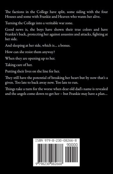 The factions in the College have split, some siding with the four Houses and some with Frankie and Heaven who wants her alive. Turning the College into a veritable war zone. Good news is, the boys have shown their true colors and have Frankie's back, protecting her against assassins and attacks, fighting at her side. And sleeping at her side, which is... a bonus. How can she resist them anyway? When they are opening up to her. Taking care of her. Putting their lives on the line for her. They still have the potential of breaking her heart but by now that's a given. Too late to back away now. Too late to run. Things take a turn for the worse when dear old dad's name is revealed and the angels come down to get her - but Frankie may have a plan... * Look inside for author notes and information as well as warnings on the books! * * This series can be read on its own but you will have a much better reader experience if you read the Pandemonium Academy Royals series first! *