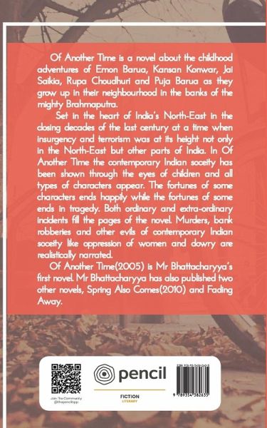 Of Another Time is a novel about the childhood adventures of Emon Barua, Barua, Kansan Konwar, Jai Saikia, Rupa Choudhuri and Puja Barua as they grow up in their neighbourhood in the banks of the mighty Brahmaputra. Set in the heart of India's North-East in the closing decades of the last century at a time when insurgency and terrorism was at its height not only in the North-East but other parts of India. In Of Another Time the contemporary Indian soceity has been shown through the eyes of children and all types of characters appear. The fortunes of some characters ends happily while the fortunes of some ends in tragedy. Both ordinary and extra-ordinary incidents fill the pages of the novel. Murders, bank robberies and other evils of contemporary Indian soceity like oppression of women and dowry are realistically narrated. Of Another Time(2005) is Mr Bhattacharyya's first novel. Mr Bhattacharyya has also published two other novels, Spring Also Comes(2010) and Fading Away.