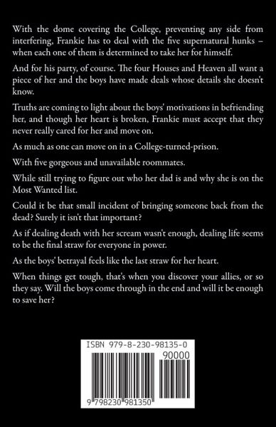 With the dome covering the College, preventing any side from interfering, Frankie has to deal with the five supernatural hunks - when each one of them is determined to take her for himself. And for his party, of course. The four Houses and Heaven all want a piece of her and the boys have made deals whose details she doesn't know. Truths are coming to light about the boys' motivations in befriending her, and though her heart is broken, Frankie must accept that they never really cared for her and move on. As much as one can move on in a College-turned-prison. With five gorgeous and unavailable roommates. While still trying to figure out who her dad is and why she is on the Most Wanted list. Could it be that small incident of bringing someone back from the dead? Surely it isn't that important? As if dealing death with her scream wasn't enough, dealing life seems to be the final straw for everyone in power. As the boys' betrayal feels like the last straw for her heart. When things get tough, that's when you discover your allies, or so they say. Will the boys come through in the end and will it be enough to save her? Author note: For any warnings, please check inside the book!