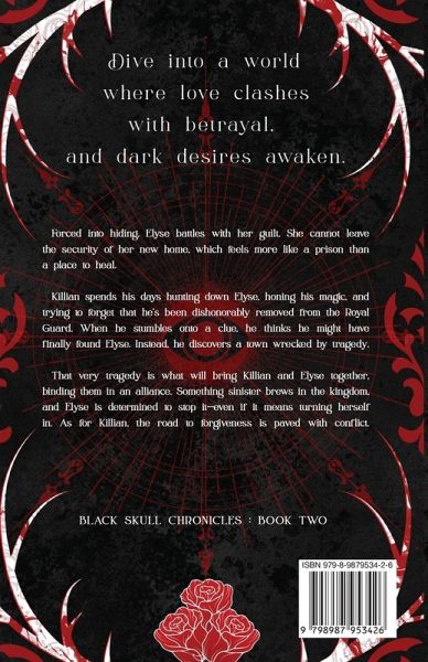 Dive into a world where love clashes with betrayal, and dark desires awaken. Forced into hiding, Elyse battles with her guilt. She cannot leave the security of her new home, which feels more like a prison than a place to heal. Killian spends his days hunting down Elyse, honing his magic, and trying to forget that he's been dishonorably removed from the Royal Guard. When he stumbles onto a clue, he thinks he might have finally found Elyse. Instead, he discovers a town wrecked by tragedy. That very tragedy is what will bring Killian and Elyse together, binding them in an alliance. Something sinister brews in the kingdom, and Elyse is determined to stop it-even if it means turning herself in. As for Killian, the road to forgiveness is paved with conflict. The Black Skull Chronicles continue with Of Blood and Roses, the ultimate enemies-to-lovers fantasy novel.