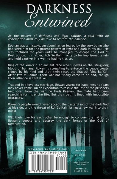As the powers of darkness and light collide, a soul with no redemption must rely on love to restore the balance. Keenan was a mistake. An abomination feared by the very being who had sired him for the potent powers of light and dark in his soul. He was tortured for years until he managed to escape the God of Destruction, his father, Roh Se Kahn, only to be imprisoned again and held captive in a war he had no ties to. King of the Vam'kir, an ancient race who survives on the life-giving blood of humans, Rowan is struggling to enforce the peace treaty signed by his kind and their twin race, the shapeshifting Ba'Kal. After two millennia, their war has finally come to an end, though their alliance is tentative. Trapped in a loveless marriage, Rowan yearns for happiness he fears may never come. On an expedition to rescue the last of the prisoners held over from the war, he finds Keenan, the mate he'd been searching for his entire life. But their path is lined with impossible obstacles. Rowan's people would never accept the bastard son of the dark God at his side, and the threat of Roh Se Kahn brings a new war into their midst. Will their love for each other be enough to conquer the hatred of Rowan's people and destroy the dark forces of the God of Destruction?
