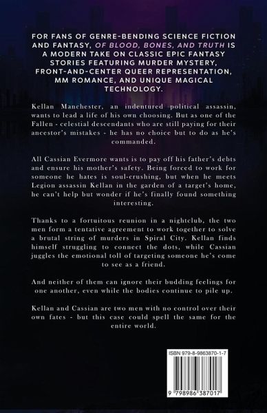 Kellan Manchester, an indentured political investigator, wants to lead a life of his own choosing. But as one of the Fallen - celestial descendants who are still paying for their ancestor's mistakes - he has no choice but to do as he's commanded. After Kellan clashes with a mysterious assassin named Cassian Evermore in the garden of a target's home, he doesn't expect to ever see the man again. But when their paths cross once more at the scene of a brutal murder, they form an alliance to keep their missions on track and prevent harm to Cassian's mother. As the bodies pile higher, rumors that the Veil is failing will turn what was once just a murder investigation into something much darker. In the underbelly of Spiral City, something demonic is brewing... A gritty neo-noir science fantasy, Of Blood, Bones, and Truth is the first book in the Brimstone and Fire series. Fans of the Cyberpunk and Blade Runner series will relish this queer murder-mystery.