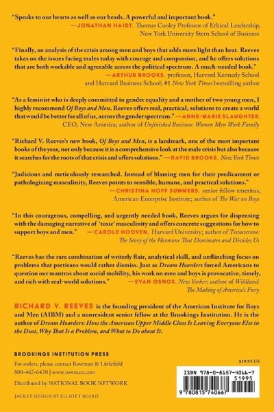 Lost. Disaffected. Adrift. Checked out. Dislocated. Withdrawn. What is happening with so many of our boys and men? Economists lament inexplicable drops in male labor force participation. Public health officials point to disproportionately male "deaths of despair" from suicide or overdose. Parents see their sons struggling and worry what it means for their future. In Of Boys and Men, Richard Reeves provides a groundbreaking diagnosis of the contemporary male malaise. Many of the rapid economic, social, and cultural changes over recent decades pose new challenges to boys and men-especially those at the bottom of the economic ladder. Black boys and men face the most acute challenges of all. Politicians on both left and right have failed to engage constructively with the problems of boys and men. Views on what it means to be a man in the twenty-first century have hardened along partisan lines. But as Reeves writes: "We can hold two thoughts in our head at once. We can be passionate about women's rights and compassionate toward vulnerable boys and men." Drawing on years of deep research as well as his personal experience as a father of three sons, Reeves offers a compelling diagnosis of the problems of boys and men-and a bold set of solutions.