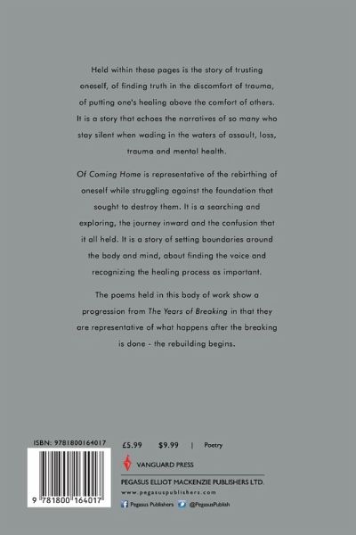 Held within these pages is the story of trusting oneself, of finding truth in the discomfort of trauma, of putting one's healing above the comfort of others. It is a story that echoes the narratives of so many who stay silent when wading in the waters of assault, loss, trauma and mental health. Of Coming Home is representative of the rebirthing of oneself while struggling against the foundation that sought to destroy them. It is a searching and exploring, the journey inward and the confusion that it all held. It is a story of setting boundaries around the body and mind, about finding the voice and recognizing the healing process as important. The poems held in this body of work show a progression from The Years of Breaking in that they are representative of what happens after the breaking is done - the rebuilding begins.