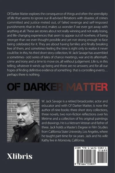 Of Darker Matter explores the consequence of things and often the serendipity of life that seems to ignore our ill-advised flirtations with disaster, of crimes committed and justice meted out, of failed revenge and self-imposed punishments that in the end, makes us wonder if we ever got away with anything at all. These are stories about not really winning and not really losing, and life-changing experiences that seem to appear out of nowhere, of being stronger than we ever thought possible and yet not strong enough to face being celebrated for it. They are about having families and finally breaking free of them, and sometimes feeling the time is right only to realize it never could be. In this, his third short story collection, W. Jack Savage has assembled a sometimes- odd series of tales of chance meetings, war and its aftermath, crime and irony and a time to move on, all without judgement. Life is, in this telling, whatever it winds up being and there are no answers; and for all our hopes of finding definitive evidence of something that is controlling events... perhaps there is nothing.
