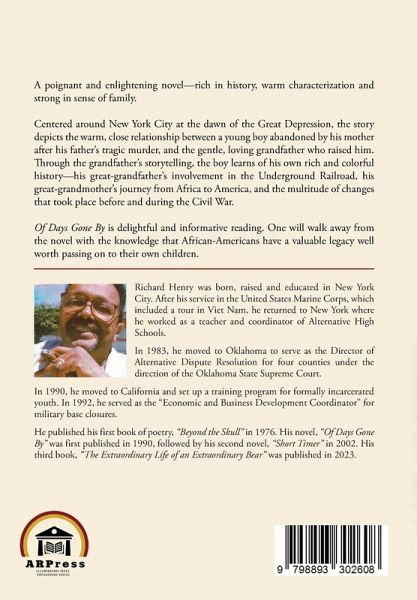 A poignant and enlightening novel-rich in history, warm characterization and strong in sense of family. Centered around New York City at the dawn of the Great Depression, the story depicts the warm, close relationship between a young boy abandoned by his mother after his father's tragic murder, and the gentle, loving grandfather who raised him. Through the grandfather's storytelling, the boy learns of his own rich and colorful history-his great-grandfather's involvement in the Underground Railroad, his great-grandmother's journey from Africa to America, and the multitude of changes that took place before and during the Civil War. Of Days Gone By is delightful and informative reading. One will walk away from the novel with the knowledge that African-Americans have a valuable legacy well worth passing on to their own children.