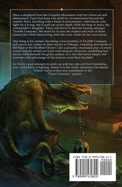 Once a shepherd from the Carpathe Mountains with her future set and determined, Taryn has been cast adrift by circumstances beyond her control. Now, traveling with a band of mercenaries-individuals who fight for a living, she is well out of her depth. With the help of Aella, the commander's daughter, Taryn will strive to find her footing amongst Twelfth Company. She must try to earn the respect and trust of those around her while discovering what she truly wants for her own future. One thing is for certain, becoming a true member of Twelfth Company will assure her a place in their travels to Dabsqin, a bustling metropolis in the heart of the Southern Desert. Like a paradise, musicians play on every corner and the streets are lined with treasure. However, something less savory lurks beneath the glitzy surface. In a city that never sleeps, real monsters take advantage of the noise to work their mischief. As Taryn's past attempts to catch up with her, she will find friendship, love, and plenty of fighting. Home is to the north; adventure lies ahead. Follow Taryn in this next installment of the "Taryn's Journey" quartet.