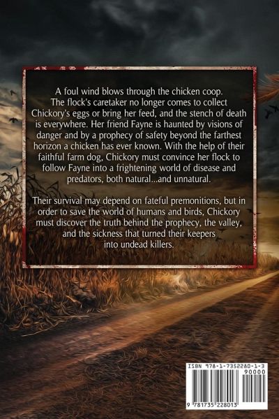 An imaginative adventure featuring a flock of chickens as they traverse an apocalyptic wasteland populated by nature's usual killers and...the undead. Billed as "a modern Watership Down meets The Walking Dead-but with a lot more feathers!" A foul wind blows through the chicken coop. The flock's caretaker no longer comes to collect Chickory's eggs or bring her feed, and the stench of death is everywhere. Her friend Fayne is haunted by visions of danger and by a prophecy of safety beyond the farthest horizon a chicken has ever known. With the help of their faithful farm dog, Chickory must convince her flock to follow Fayne into a frightening world of disease and predators, both natural...and unnatural. Their survival may depend on fateful premonitions, but in order to save the world of humans and birds, Chickory must discover the truth behind the prophecy, the valley, and the sickness that turned their keepers into undead killers. Readers of animal classics such as Plague Dogs and Call of the Wild, as well as lovers of the undead, will find modern heroes in Chickory and Fayne.