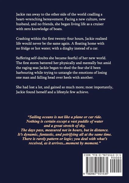 Jackie ran away to the other side of the world cradling a heart-wrenching bereavement. Facing a new culture, new husband, and no friends, she began living life as a cruiser with zero knowledge of boats. Crashing within the first twenty-four hours, Jackie realised life would never be the same again. A floating home with no fridge or hot water; with a dinghy instead of a car. Suffering self-doubts she became fearful of her new world. The first storm battered her physically and mentally but amid the raging seas Jackie began to shed the fear she'd been harbouring while trying to untangle the emotions of losing one man and (literally) falling head over heels with another. She had lost a lot, and gained so much more; most importantly, Jackie found herself and a lifestyle few achieve. Sitting in an office Australia after running away from London after Martin died, I realised I could be anyone in the world. It was all the same, grey walls, buzzing phones, suited personal. I hated it. I rang Noel, 'I am resigning, let's go buy a boat!'