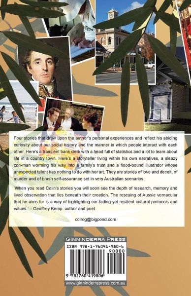 Four stories that draw upon both the author's personal experiences and reflect his abiding curiosity about our social history and the manner in which people interact with each other. Here's a transient bank clerk with a head full of statistics and a lot to learn about life in a country town. Here's a storyteller living within his own narratives, a sleazy con-man worming his way into a family's trust and a flood-bound illustrator whose unexpected talent has nothing to do with her art. They are stories of love and deceit, of murder and of brash self-assurance set in very Australian scenarios. 'When you read Colin's stories you will soon see the depth of research, memory and lived observation that lies beneath their creation. The rescuing of Aussie vernacular that he aims for is a way of highlighting our fading yet resilient cultural protocols and values.' - Geoffrey Kemp. author and poet