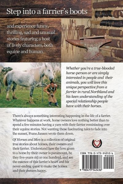 Step into a farrier's boots and experience funny, thrilling, sad and unusual stories featuring a host of lively characters, both equine and human. Whether you're a true-blooded horse-person or are simply interested in people and their animals, you will love this unique perspective from a farrier in rural Northland and his keen understanding of the special relationship people have with their horses. There's always something interesting happening in the life of a farrier. Whatever happens at work, horse owners love nothing better than to spend a few minutes having a yarn with their farrier reminiscing over their equine stories. Not wanting these fascinating tales to fade into the sunset, Frans Jansen wrote them down. Of Horses and Men is a collection of original true stories about horses, their owners and their farrier. Understand how the love given to a horse by their owner is paramount, be they five-years old or one hundred, and see the essence of this farrier's heart and his never-ending quest to make the horses and their owners happy.