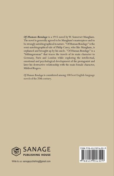 Of Human Bondage is a 1915 novel by W. Somerset Maugham. The novel is generally agreed to be Maugham's masterpiece and to be strongly autobiographical in nature. ""Of Human Bondage"" is the semi-autobiographical tale of Philip Carey, who like Maugham, is orphaned and brought up by his uncle. ""Of Human Bondage"" is a ""bildungsroman"" that traces the travels of its main character to Germany, Paris and London while exploring the intellectual, emotional and psychological development of the protagonist and later his destructive relationship with the main female character, Mildred Rogers. Of Human Bondage is considered among 100 best English-language novels of the 20th century.