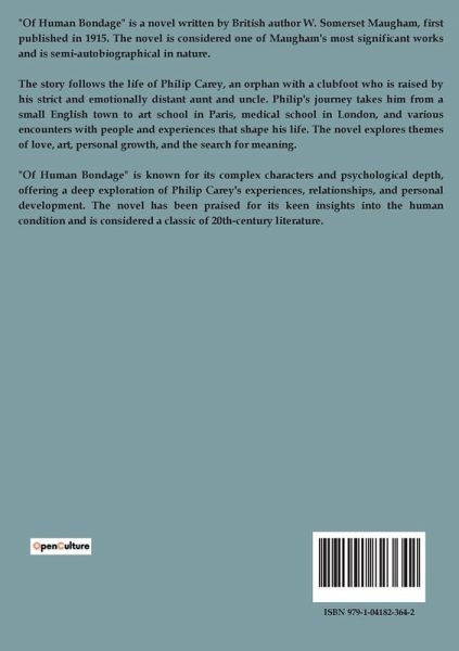 "Of Human Bondage" is a novel written by British author W. Somerset Maugham, first published in 1915. The novel is considered one of Maugham's most significant works and is semi-autobiographical in nature. The story follows the life of Philip Carey, an orphan with a clubfoot who is raised by his strict and emotionally distant aunt and uncle. Philip's journey takes him from a small English town to art school in Paris, medical school in London, and various encounters with people and experiences that shape his life. The novel explores themes of love, art, personal growth, and the search for meaning. "Of Human Bondage" is known for its complex characters and psychological depth, offering a deep exploration of Philip Carey's experiences, relationships, and personal development. The novel has been praised for its keen insights into the human condition and is considered a classic of 20th-century literature.