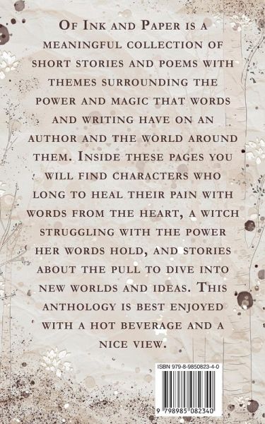 Of Ink and Paper is a meaningful collection of short stories and poems with themes surrounding the power and magic that words and writing have on an author and the world around them. Inside these pages you will find characters who long to heal their pain with words from the heart, a witch struggling with the power her words hold, and stories about the pull to dive into new worlds and ideas. This anthology is best enjoyed with a hot beverage and a nice view.
