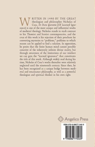 Written in 1440 by the great theologian and philosopher Nicholas of Cusa, De Docta Ignorantia (Of Learned Ignorance) stands as one of the most unique and influential works of medieval theology. Nicholas stands in stark contrast to his Thomist and Scotist contemporaries, and the crux of this work is his rejection of their penchant for converting mysteries to "problems," problems to which reason can be applied to find a solution. In opposition, he posits that the finite human mind cannot possibly conceive of the inherently infinite divine reality, but through awareness of the limitations of our intellect we can gain the "learned ignorance" that constitutes the title of this work. Although widely read during his time, Nicholas of Cusa's works remained relatively unread until the nineteenth century. Since then, he has been recognized as a unique bridge between medieval and renaissance philosophy, as well as a powerful theologian and spiritual thinker in his own right.