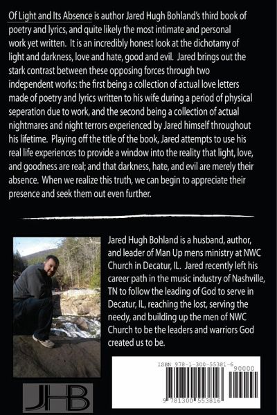 Of Light and Its Absence is author Jared Hugh Bohland's third book of poetry and lyrics, and quite likely the most intimate and personal work yet written. It is an incredibly honest look at the dichotomy of light and darkness, love and hate, good and evil. Jared brings out the stark contrast between these opposing forces through two independent works: the first being a collection of actual love letters made of poetry and lyrics written to his wife during a period of physical seperation due to work, and the second being a collection of actual nightmares and night terrors experienced by Jared himself throughout his lifetime. Playing off the title of the book, Jared attempts to use his real life experiences to provide a window into the reality that light, love, and goodness are real; and that darkness, hate, and evil are merely their absence. When we realize this truth, we can begin to appreciate their presence and seek them out even further.